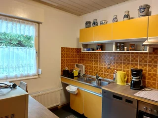 Die Retro-Küche mit moderner Ausstattung vereint nostalgischen Stil mit zeitgemäßem Komfort. Sie ist komplett ausgestattet mit Spülmaschine, Cerankochfeld, Backofen, Kühlschrank, Mikrowelle sowie Kaffeemaschine, Toaster und Wasserkocher – ideal für gemeinsames Kochen und Genießen.